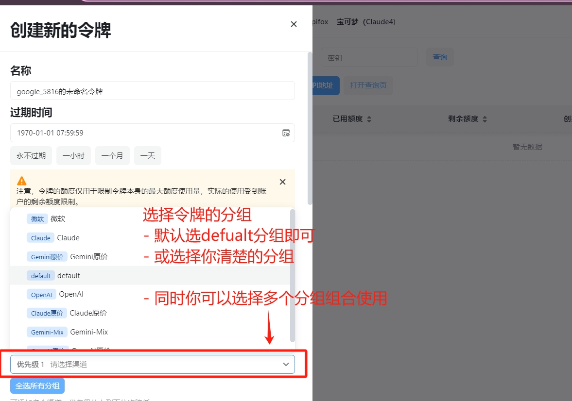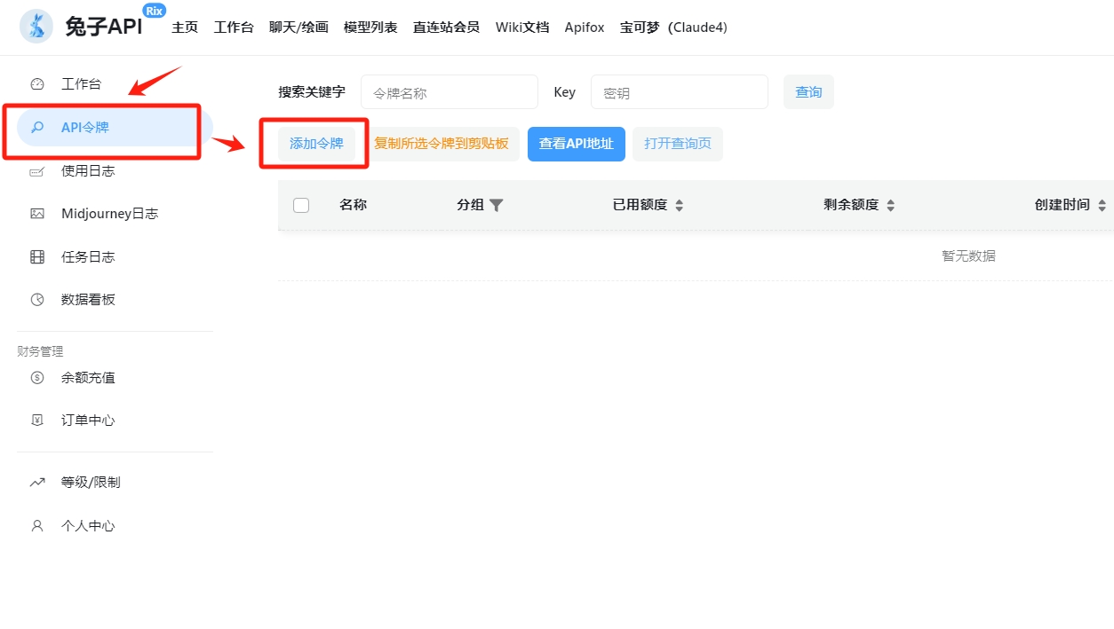 2. 点击令牌,生成你的令牌为后续调用大模型使用;令牌即常说的API-KEY