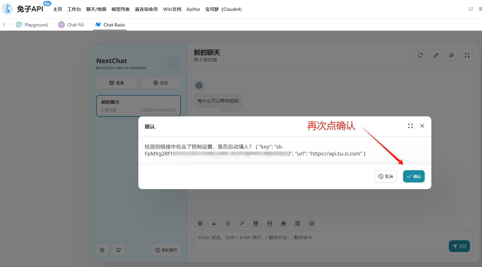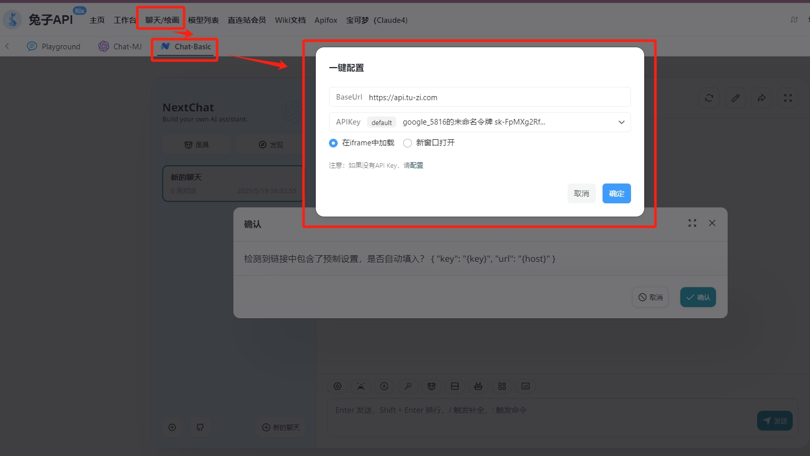 3. 进入聊天界面进行配置,填入接口地址https://api.tu-zi.com 和上面选择的令牌