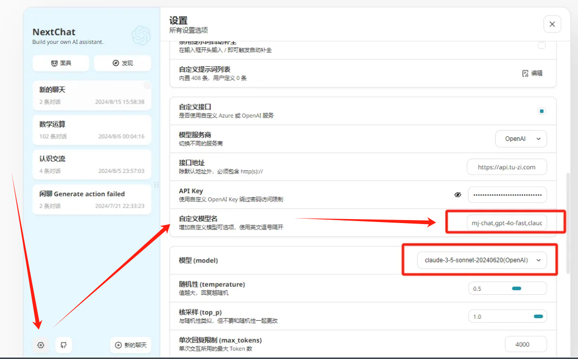 4. 如果是非openai的模型,需要在自定义模型名中加入claude-3-5-sonnet-20240620 +@OpenAI =claude-3-5-sonnet-20240620@OpenAI
